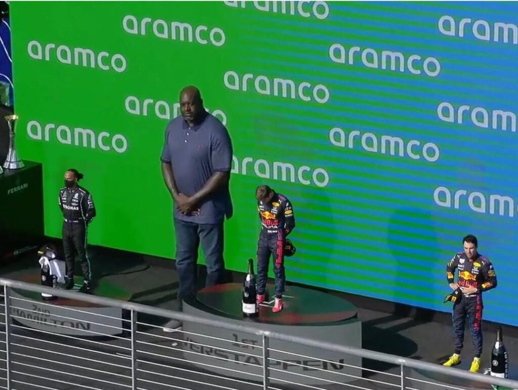 When he stepped onto the podium to present the trophies, the height contrast was extraordinary. Even with world-class athletes like Max Verstappen and Lewis Hamilton in their racing boots, Shaq still stood head and shoulders above them — literally.