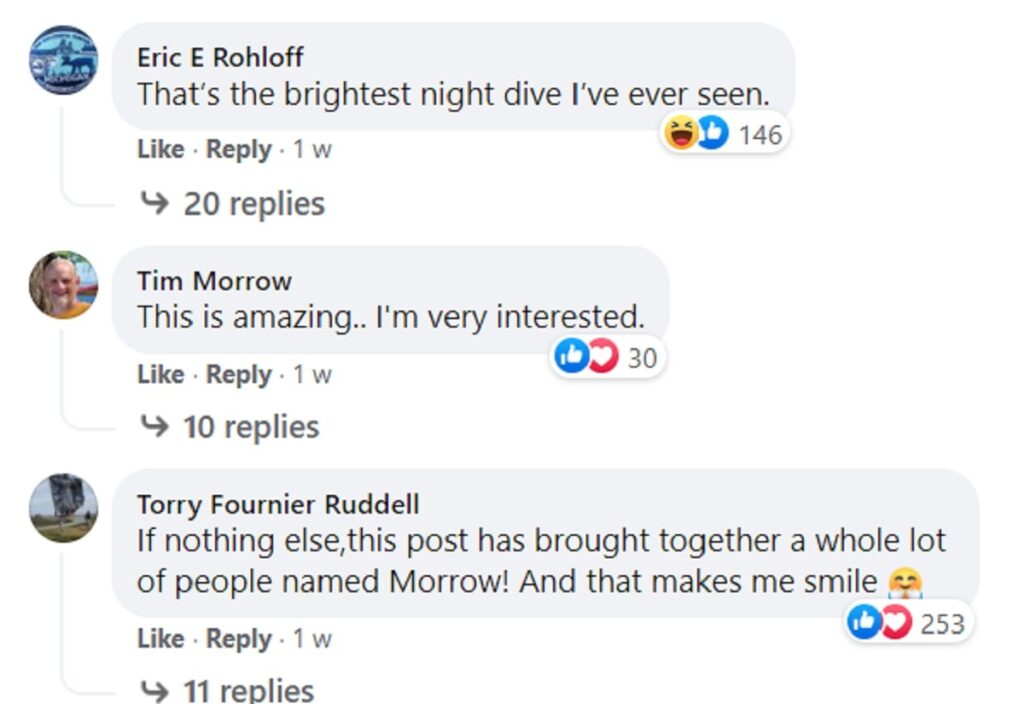 “So, look what I found when I was washing windows (and cruising along with the fish)… any Morrows out there know a George Morrow that would’ve written this circa 1926? COOLEST night diving EVER.”