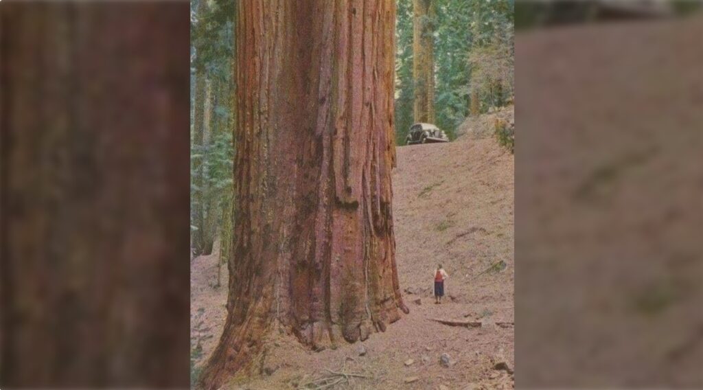 This striking photograph from the 1950s shows a woman standing beside a colossal Redwood tree, one of the most awe-inspiring and ancient life forms on Earth.